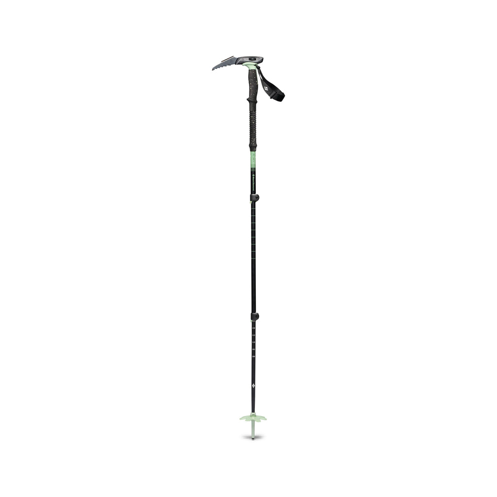 ポールとしての使用長は75cmから140cm。75cmというと歩行時のサポートも強く意識しているストレートシャフトピッケルの最大長モデルとほぼ同じです。グリップではなくピッケル同様にピックヘッドを掴んで保持できます。ポールとしてグリップを握る場合は状況に応じて100〜140cmの間で長さを調整できます。なおストラップはガースヒッチで取り外し可能。またフリックロックの調整用にドライバービットが下段シャフト上部に内蔵されています。フィールドでの調整にも素早く対応できます。