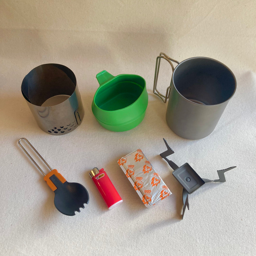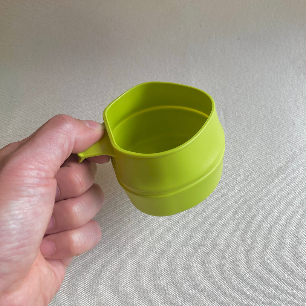 容量は休憩時に飲むお茶やコーヒー、テント泊時の晩酌などに丁度良大きさ。折り畳み線まで注水すると125mlなので、覚えておくと野外調理時の計量カップとしても使えます。折り畳んだフォールダーカップは、兄弟商品であるフォールダーカップビッグ内に丁度収まるサイズ。色々な鍋やカップとのスタッキングに好相性なので、自分だけの組み合わせを見つけてみてください。