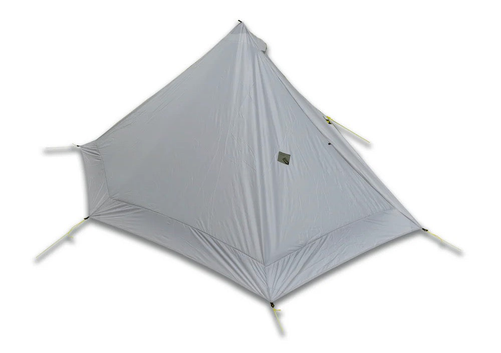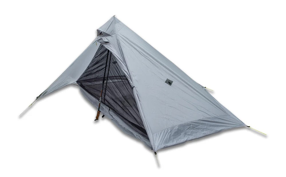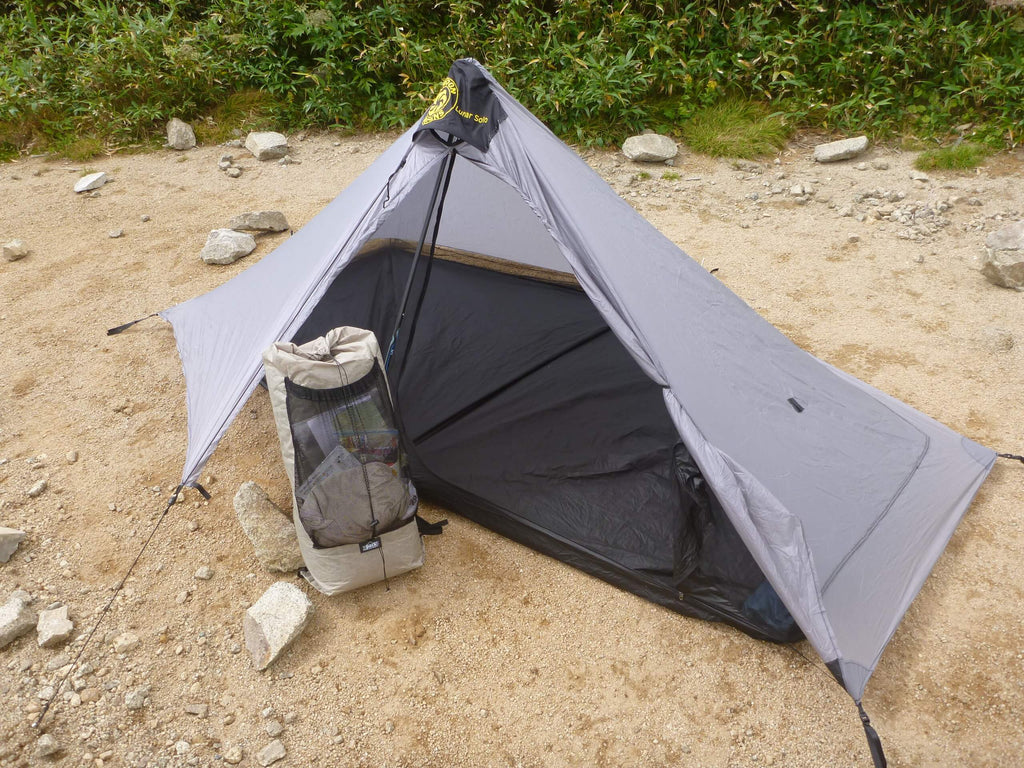 居住空間はワンポールテント特有のクセがあるものの、ひとりならば長期間のハイキングにおいても不足はなんらありません。短期間ならふたりでも使用可能。前室部分のフライは換気用にやや短いため設営の際の風向きには若干の注意を要しますが、六角錐形状は風雨を受け流すにも効果的です。なお設営には125cmのポールが必要になります。北米のスルーハイカーたちは虫対策や雨対策の容易さといったことから、蚊帳とバスタブフロアを装備したルナソロのようなタープテント形状を使うのが一般的です。