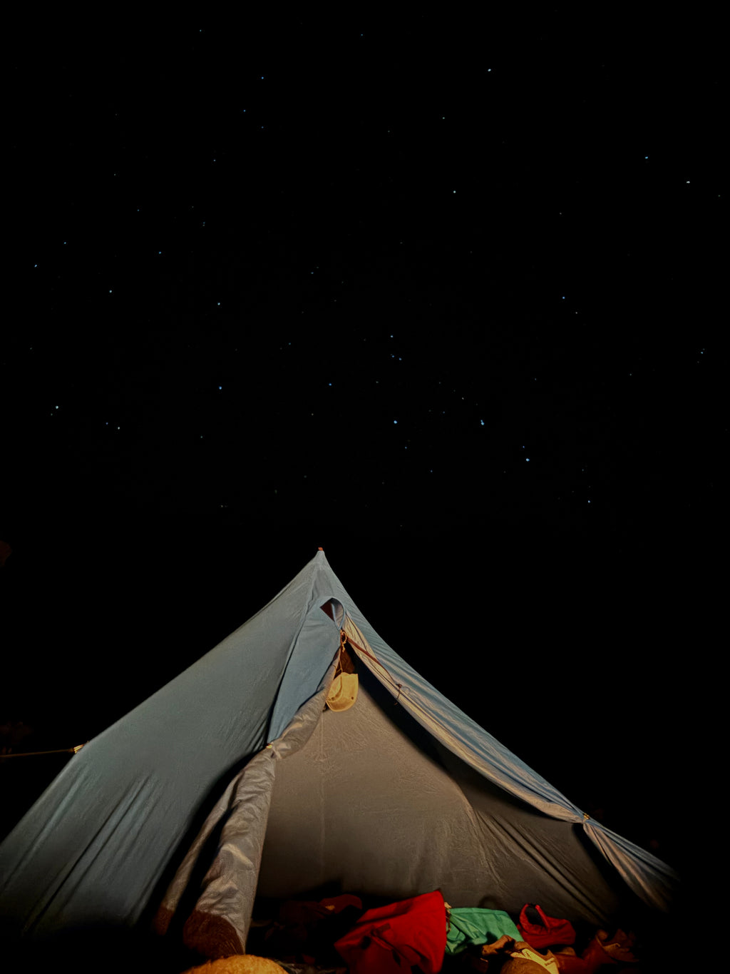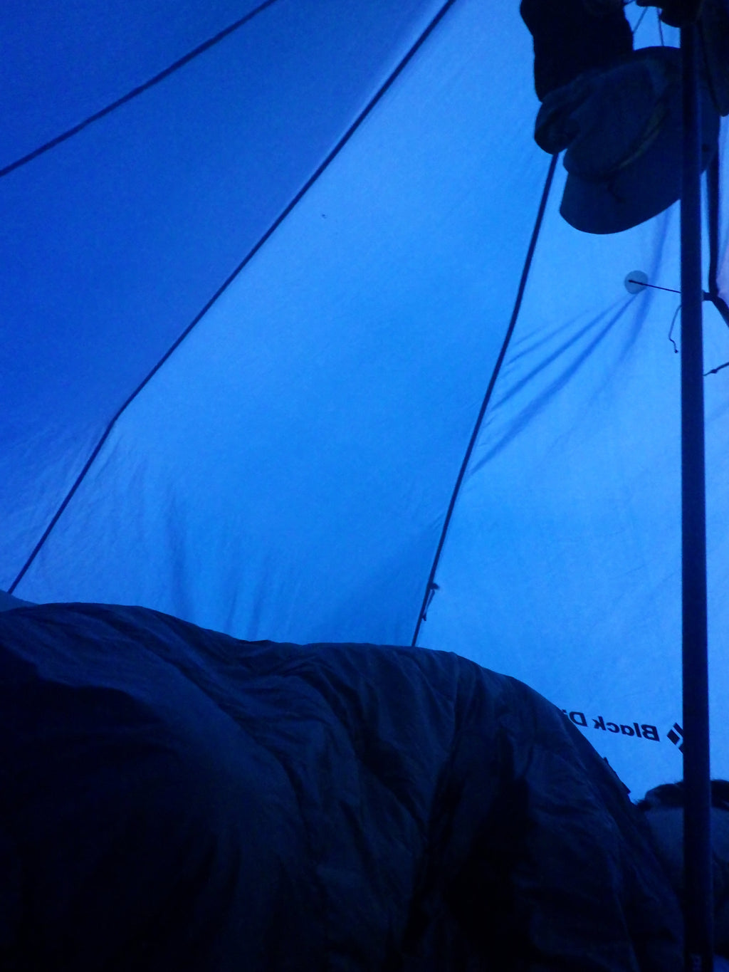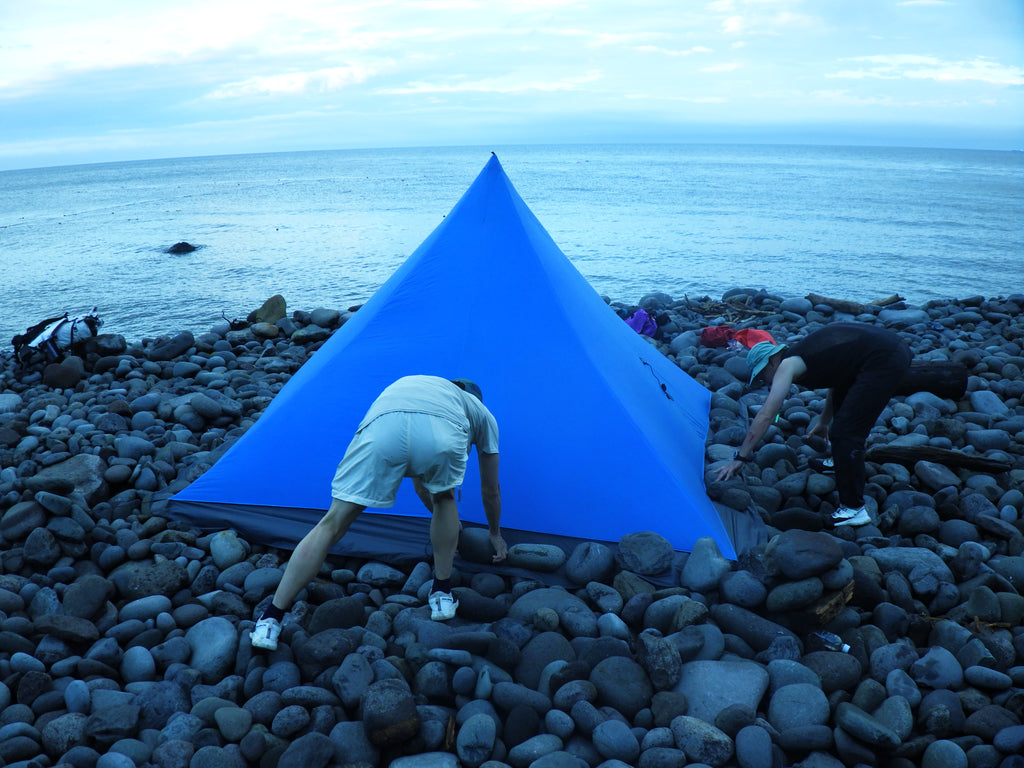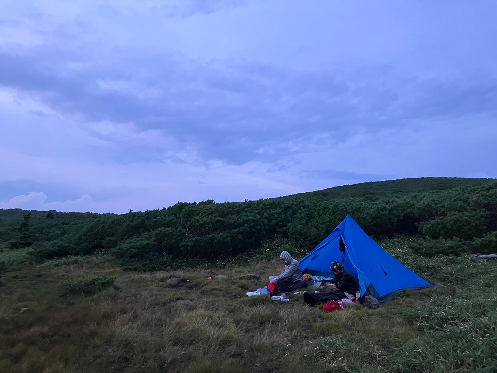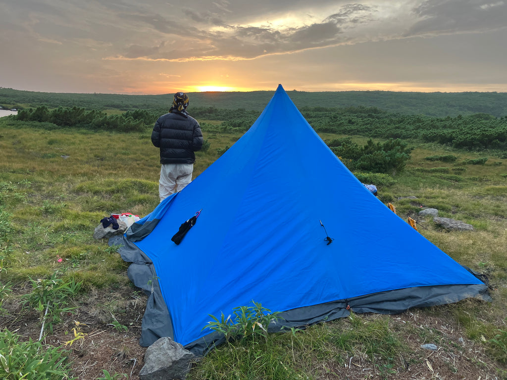 ユニークな構造のベンチレーターが入口ジッパー上部に備わっていて、室内換気を促進します。付属のカーボンポールは細かい高さ調節が可能。またトレッキングポール2本を組み合わせて代用したり、木に渡した紐から上部を吊るす様にして設営すれば、カーボンポール(330g)を省略できます。4人で使用すると一人当たりの重量負担は約400g。ツェルト並みの重さでこの室内サイズなら、グループ山行にはうってつけのシェルターと言えるでしょう。