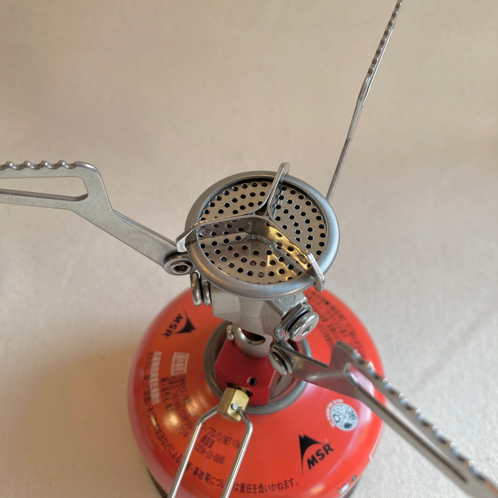 バーナーヘッドには小さな風防が被せられていて、燃焼部を3区画に分ける形になっていますが、これは燃焼時に風で立ち消えることを抑える役目があります。強風下で使用する場合は、風上側に体を入れ風を遮るとより効果的です。