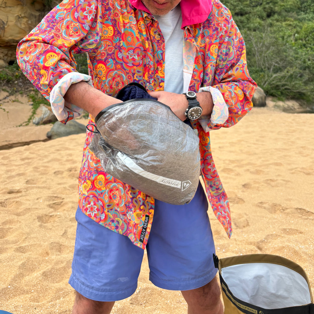 HMG社の容量40L、もしくは55Lモデルへのパッキングに丁度良い寸法で作られたスタッフサックです。テントや寝袋、ウェアなどに付属しているスタッフサックサイズのせいでバックパック内にデッドスペースが生じる場合は、ポッズに詰め替え直すことで隙間なく綺麗にパッキングが可能。トレイルバムのステディーやゴッサマーギアのゴリラ、ULAのCDTなど他社のものでも同容量くらいのバックパックなら綺麗に収まります。