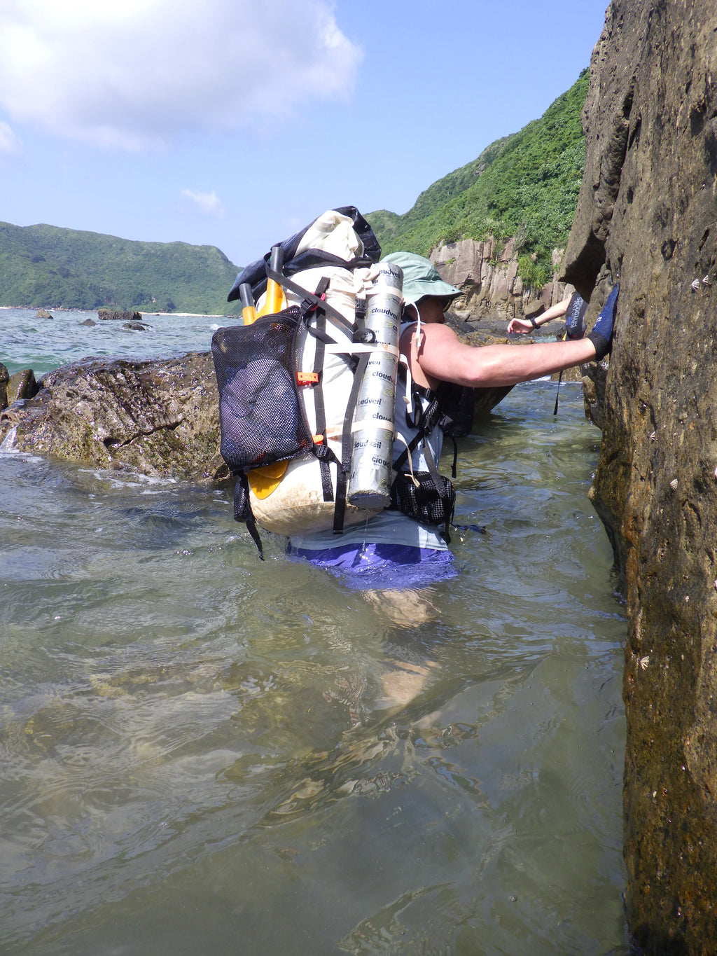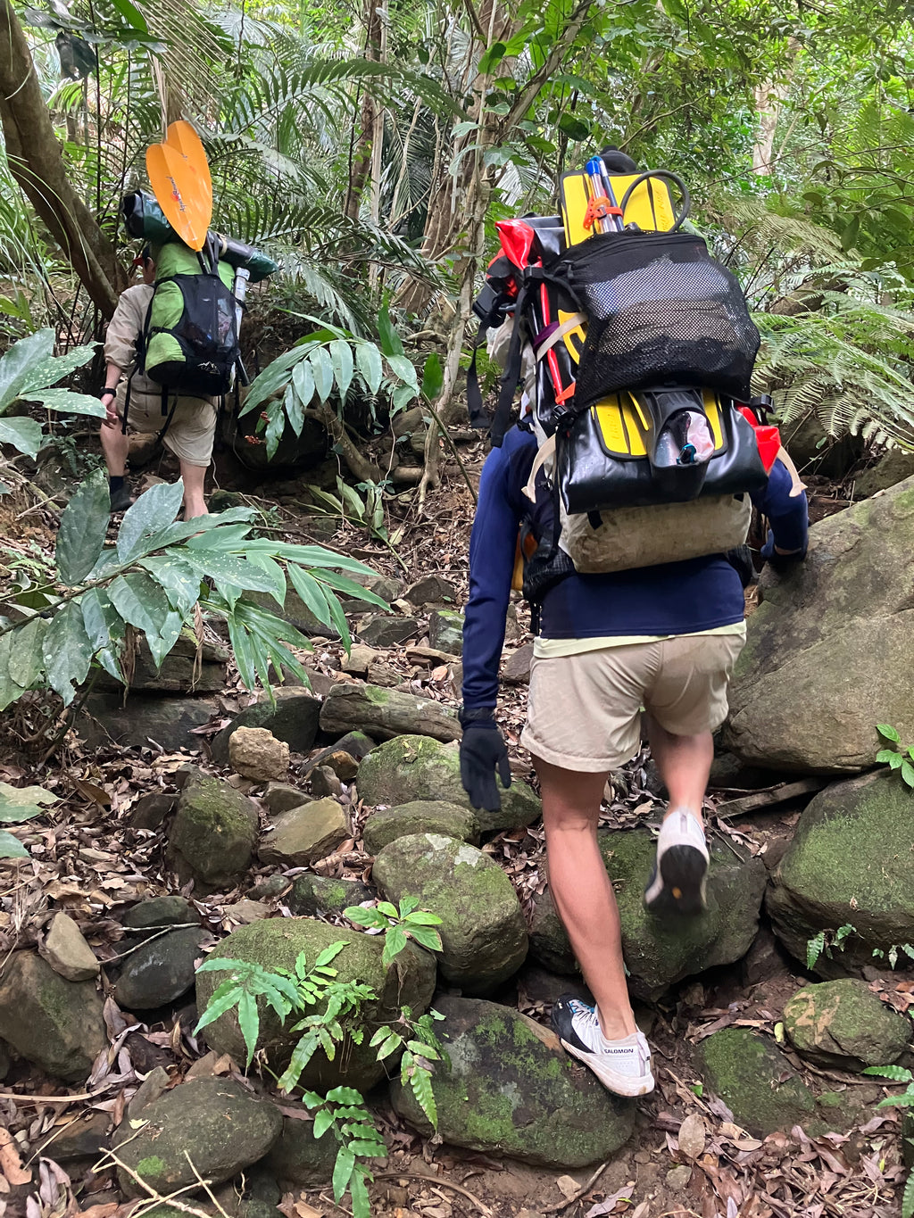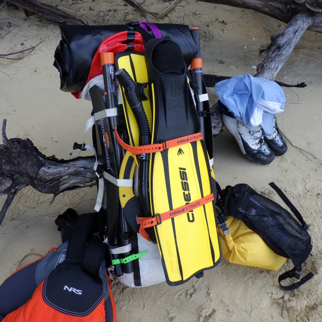 そして、もうひとつポーターを特徴づける作りとして、バックパック本体に縫い付けられたデイジーチェーンがあります。これを利用すればパック内やポケットに収めにくい物(トレッキングポール・カメラ三脚・パックラフト・パドル・PFD・スキー・ボード・ロングフィンなど)を括り付けられます。もしどうしても外ポケットが必要になった時にも、後付けするのに役立ちます。つまり、使い手の想像力次第であらゆることが可能となるのです。