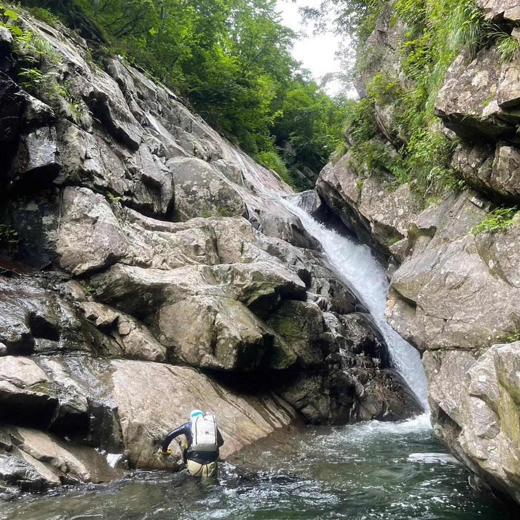 ポーターの特徴を一言で表すなら「シンプル」。雨蓋はもちろん外ポケットが一切付いていない姿は、生地感も相まって異質なモデルに見えるかもしれませんが、実はクラシックなアルパインパックそのものであり、昔からあるスタイルなのです。また、ポケットがないため使いにくそうな印象を抱くかもしれませんが、逆に利点(藪漕ぎ時にメッシュポケットが枝木に干渉しない・沢での泳ぎや雪面での滑落時においてポケット内の物を紛失することがない)もあるので、沢登りや雪山においては有効な外観と言えます。