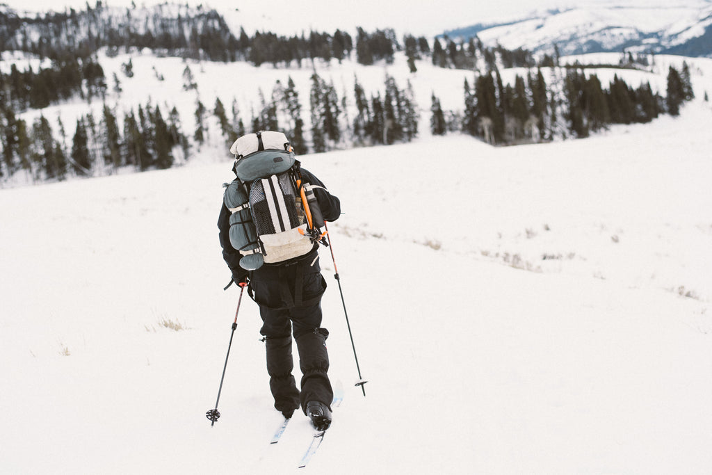 長期のテント泊にも対応できる容量は、携行する食料・水の量にもよりますが1〜5泊くらいの行程に対応します。無雪期なら40Lくらいでテント泊へ行く人も、積雪期は寝袋や防寒着の嵩が増えるため、このくらいの容量を選ぶことが増えます。幅広なウエストベルトに加えて背面にはアルミフレーム2本(取り外し可)を備えているので、今まで一般的なバックパックを背負ってきた人でも安心してお使い頂けます。