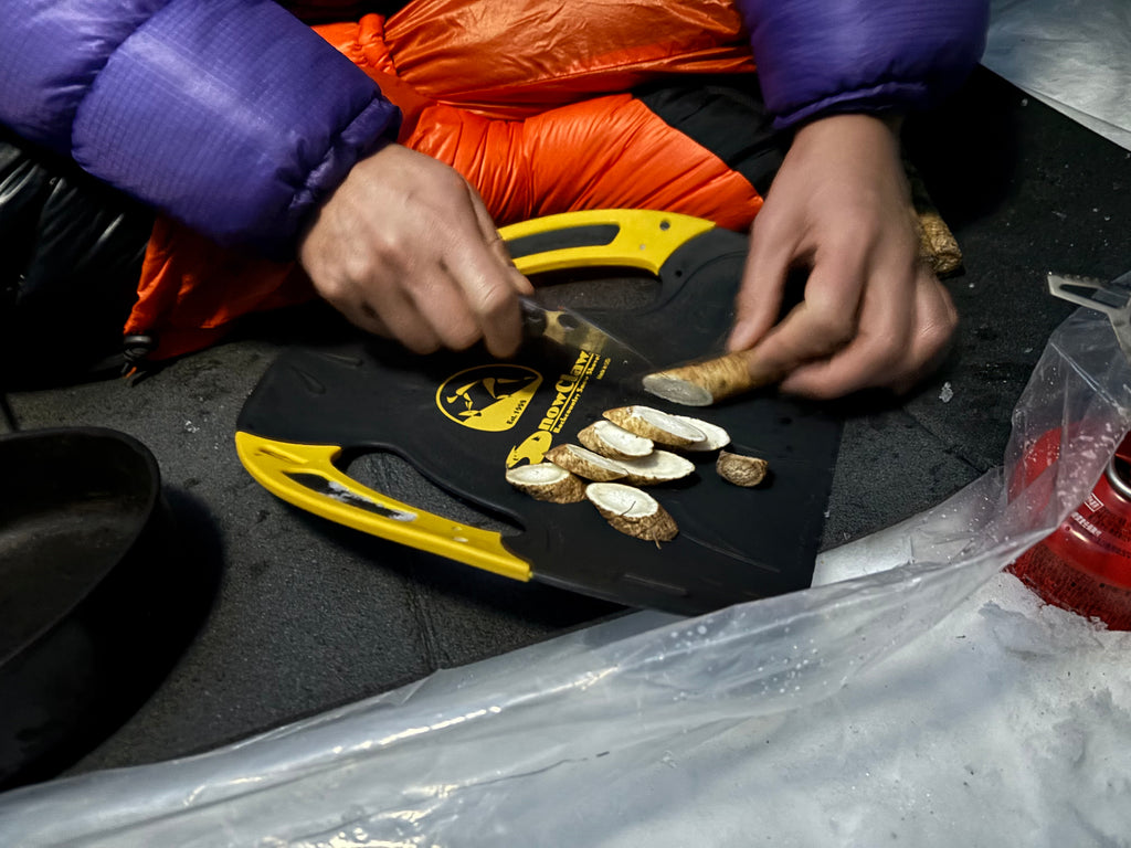 軽さだけでなく屈曲性にも優れているので、バックパックへの収納や外付けにも融通が利きやすく、その特性を利用して非常時の副木としても活用できます。広い面積を生かしてテント設営時のスノー&サンドアンカーとしても使えるし、いわゆるシリセードの際にスレッド(ソリ)としてお尻の下に敷くのも面白いアイデア。その湾曲した形を利用すれば折り曲げられる調理用まな板としても使えるので、暖かい食事を作る際にも優秀な道具です。