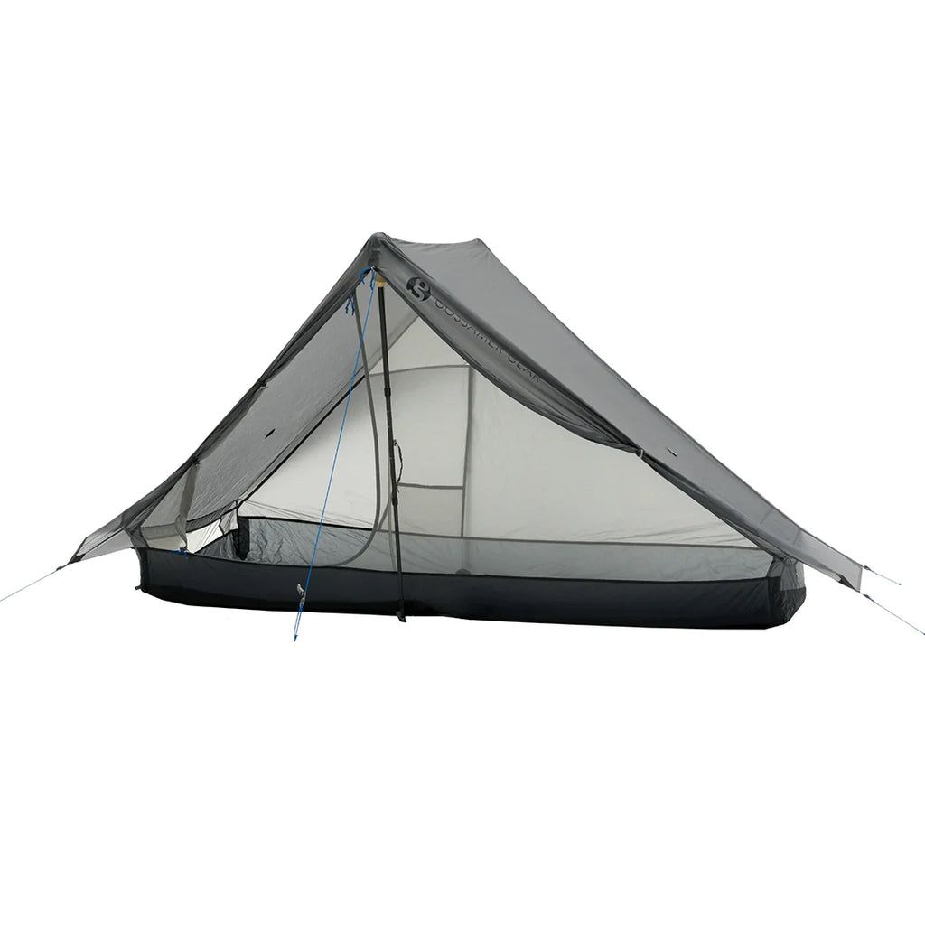 ポール2本でテント内部の空間をつくるため、ワンポールモデルより広い居住空間を確保できることが最大の特徴です。特にテント内上部が広々とするため圧迫感がありません。ゴッサマーギアのワンはそんな軽量ハイキングテントにおける2ポールモデルの改革者です。以前から2ポールモデルのテントはありましたが、ワンはポール配置を工夫することで従来の2ポールモデルに比べ格段の居住空間をうみだしています。この流れは他メーカーの後発2ポールモデルにも引き継がれることになります。