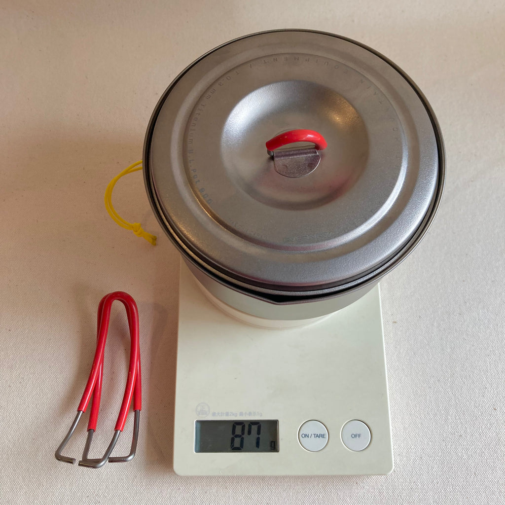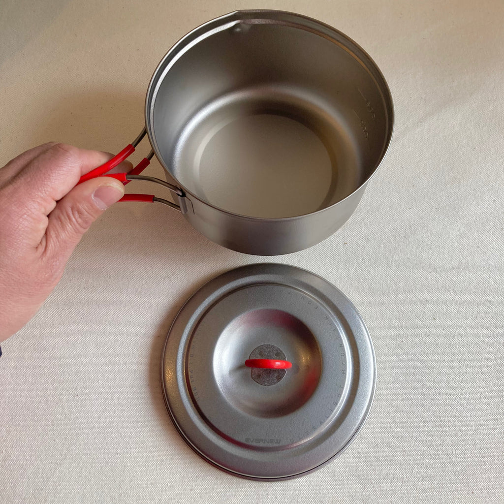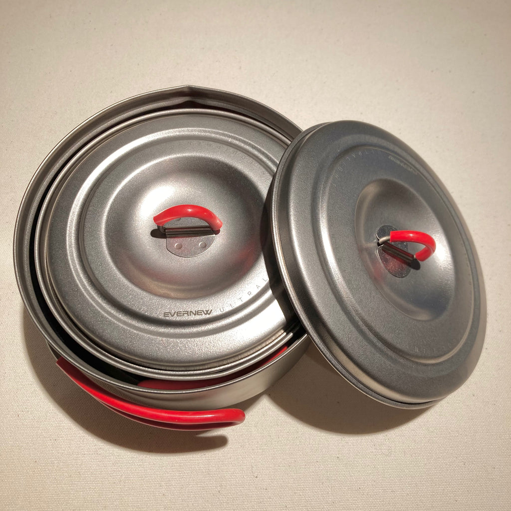 日本が誇るチタンクッカーブランドであるエバニューの1〜2人用チタン製鍋。ひと回り小さいTiULポット600を内側にスタッキングできます。重量は実測106g、ハンドルを取り外せば87g。軽量なのは勿論ですが、平形鍋なので調理時の安定感と作業性に優れます。