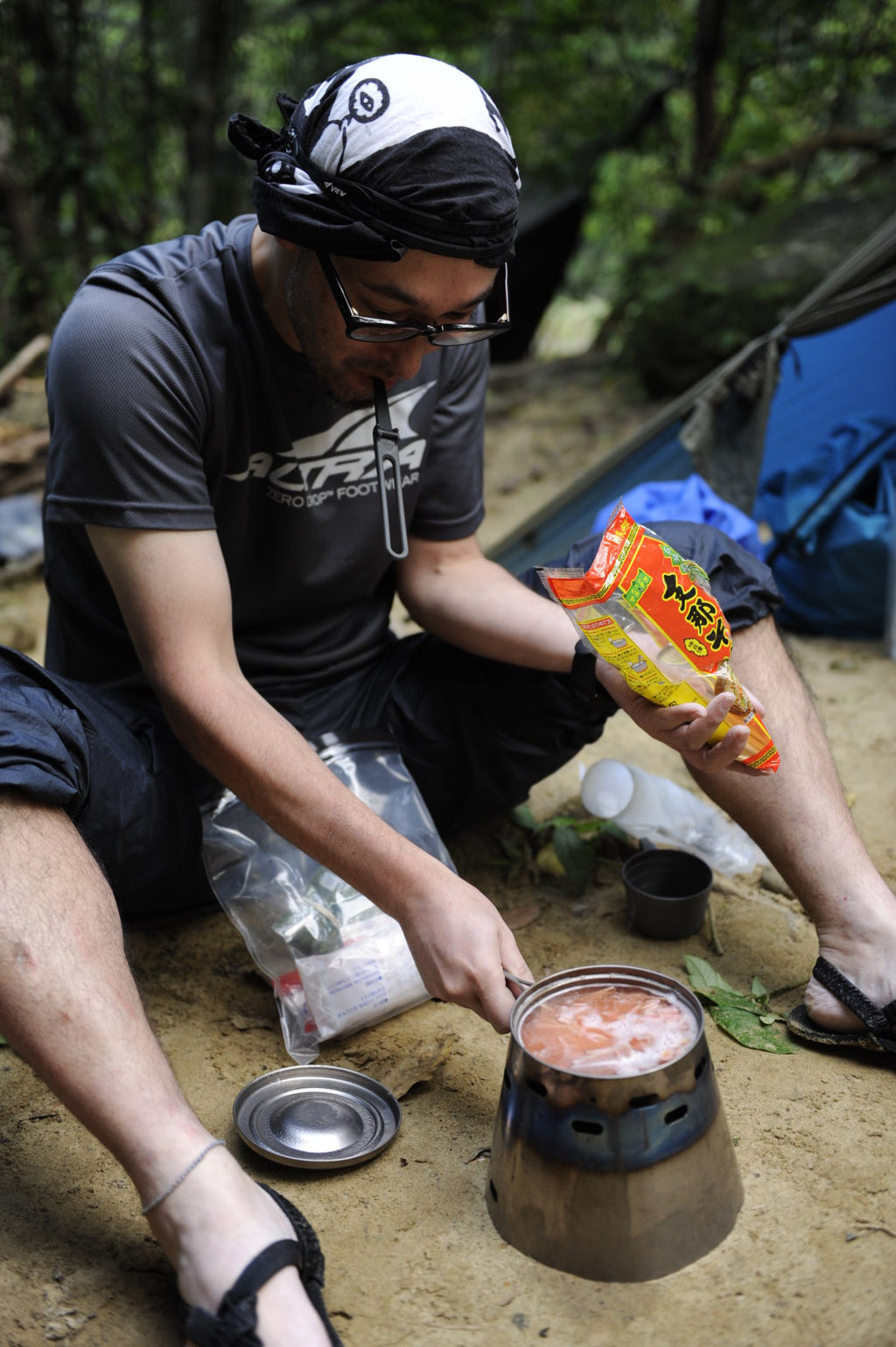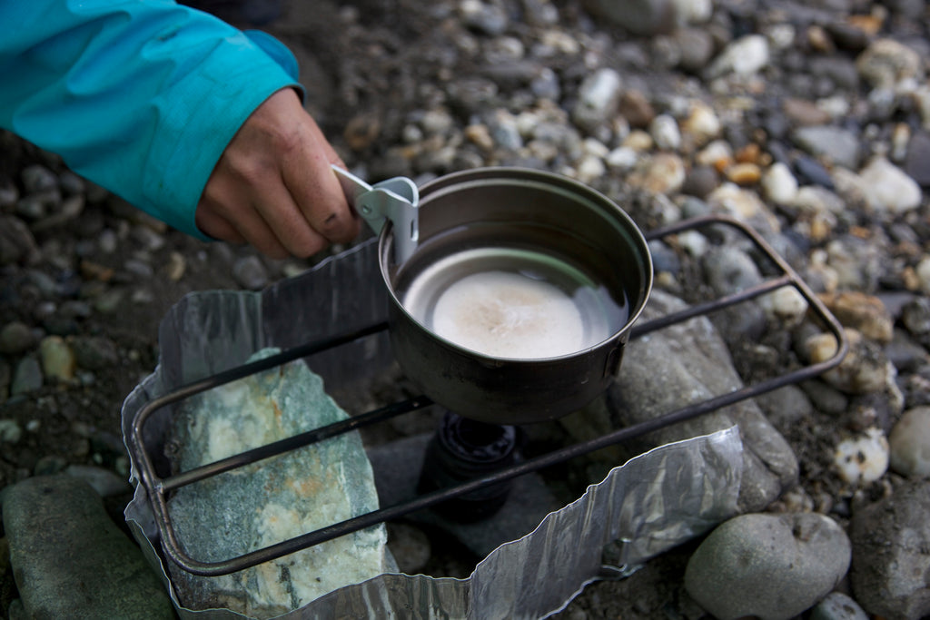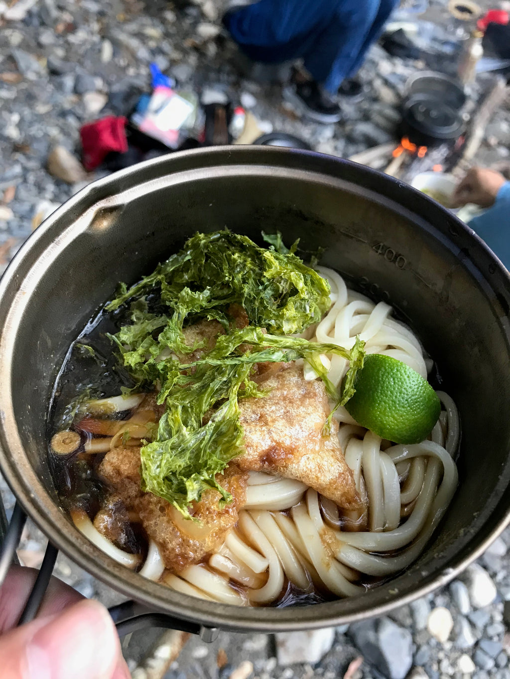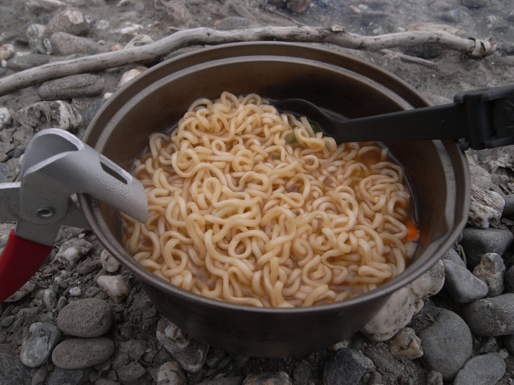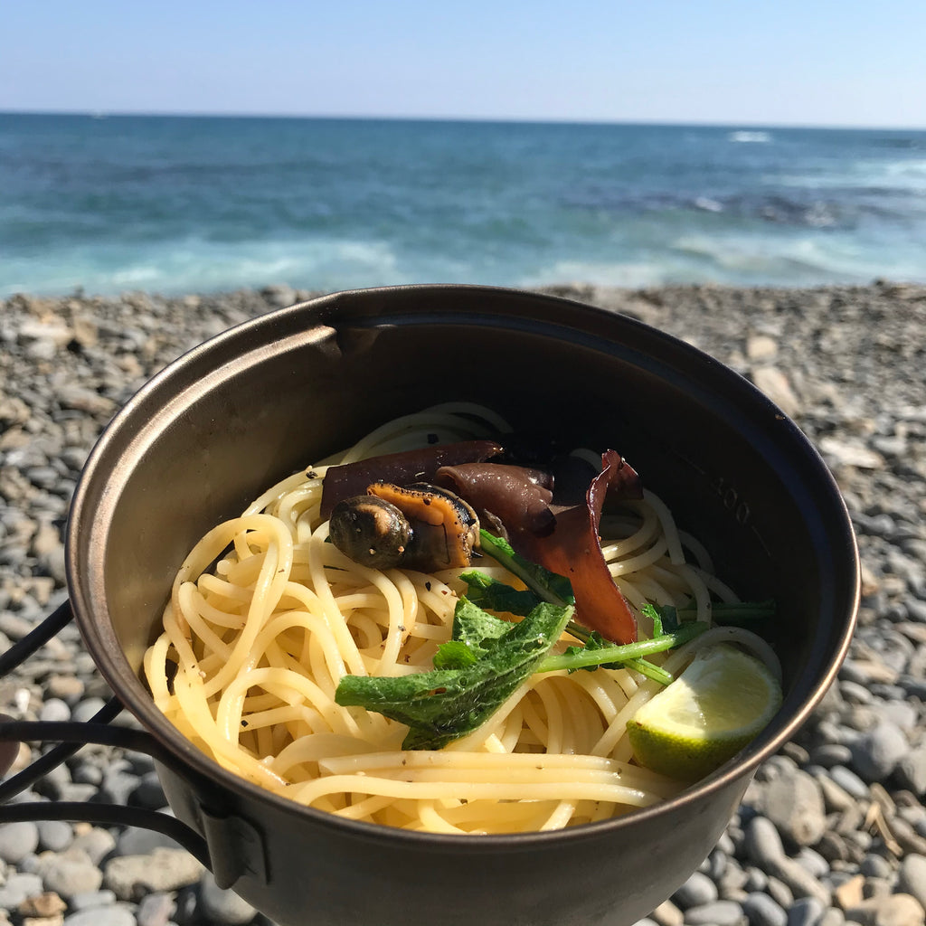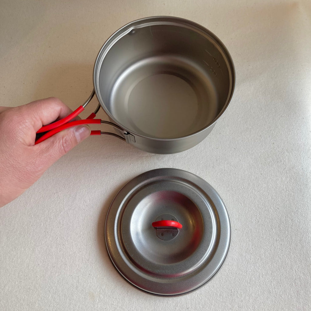 実測91g、ハンドルを取り外した状態なら僅か72gになる軽量チタンクッカー。容量はソロハイキングに丁度良い600mi。お湯を沸かしてアルファ米とスープに注ぎ、残ったお湯で湯戻し待ち中のお茶を作るなんてことができます。平形鍋なので縦長鍋と比べて調理するのも簡単。いつもの家庭の鍋と同じ感覚で扱えます。