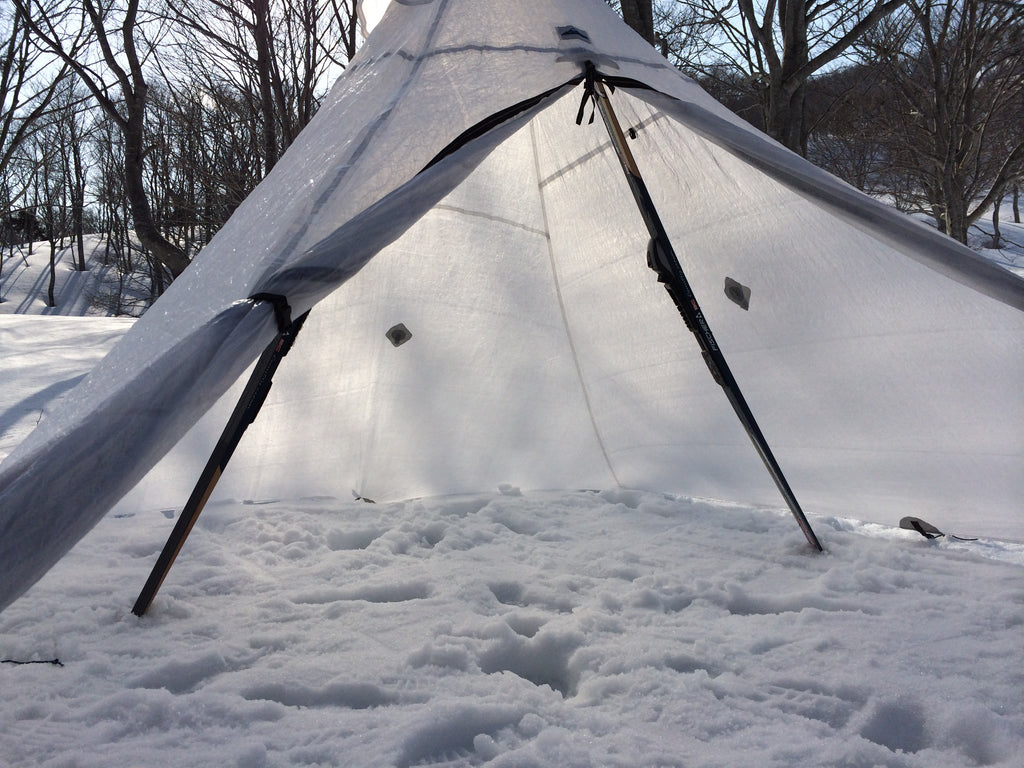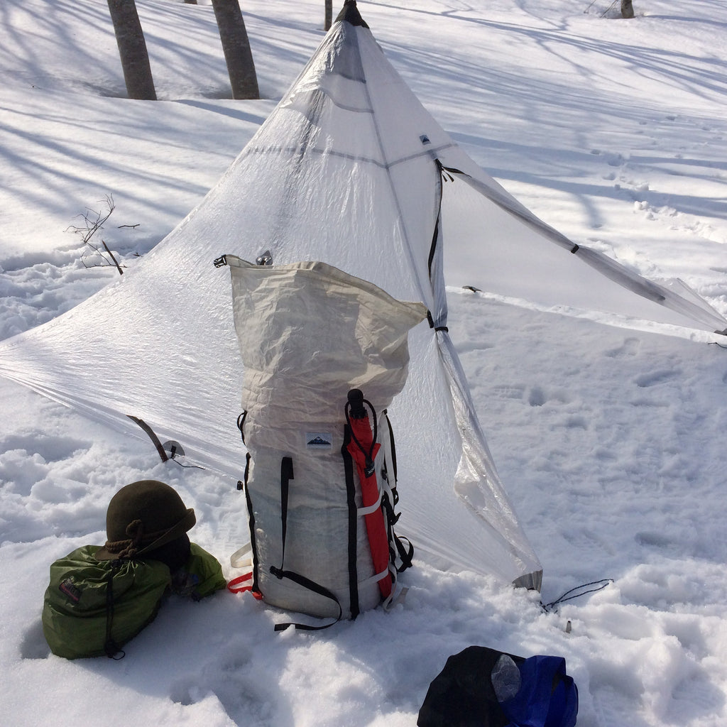 組み合わせて使えるインサートテント(バスタブフロアと蚊帳付き)も展開されていますが、重量増を考えるとフロアレス使用に絞った方がウルタミッド2の軽さと高居住性を感じられます。そして、フロアレスの特徴(いちいち靴を脱がずに出入りできる・緊急時にアイゼン着用のままでも床生地を傷つけない・結露溜まりを気にせずに済む・調理が楽など)も魅力です。濡れた地面へのマット直敷きを避けたい場合は、SOLエマージェンシーブランケットなどのポリエチレン素材シート(簡単に言えば無透湿なビニールシート)を敷いて使ってください。タイベックなどの透湿性素材をグランドシートに使うことは勧めません。